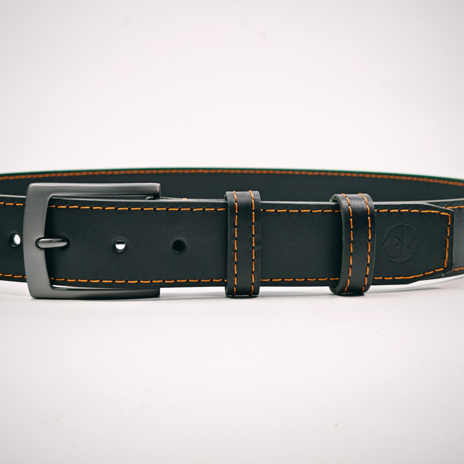 Curea piele naturala40 mm, Styx, neagra, cusatura maro cognac, catarama solida.