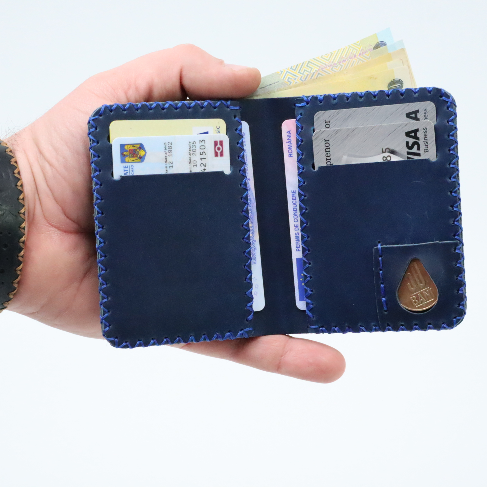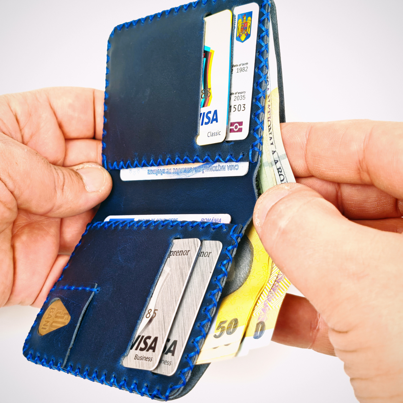 Structura interioară este bine gândită: include 6 compartimente pentru carduri, un spațiu generos pentru bancnote și un buzunar pentru monede – toate organizate eficient într‑un format subțire, comod de purtat în buzunar sau geantă. Textura pielii naturale și cusăturile realizate manual asigură durabilitate și o senzație plăcută la atingere.