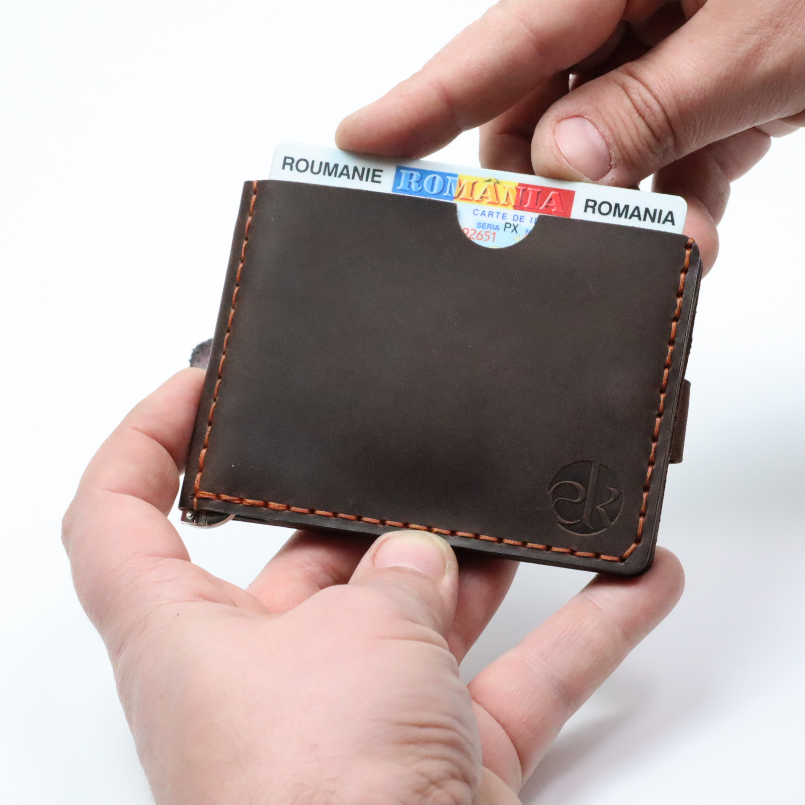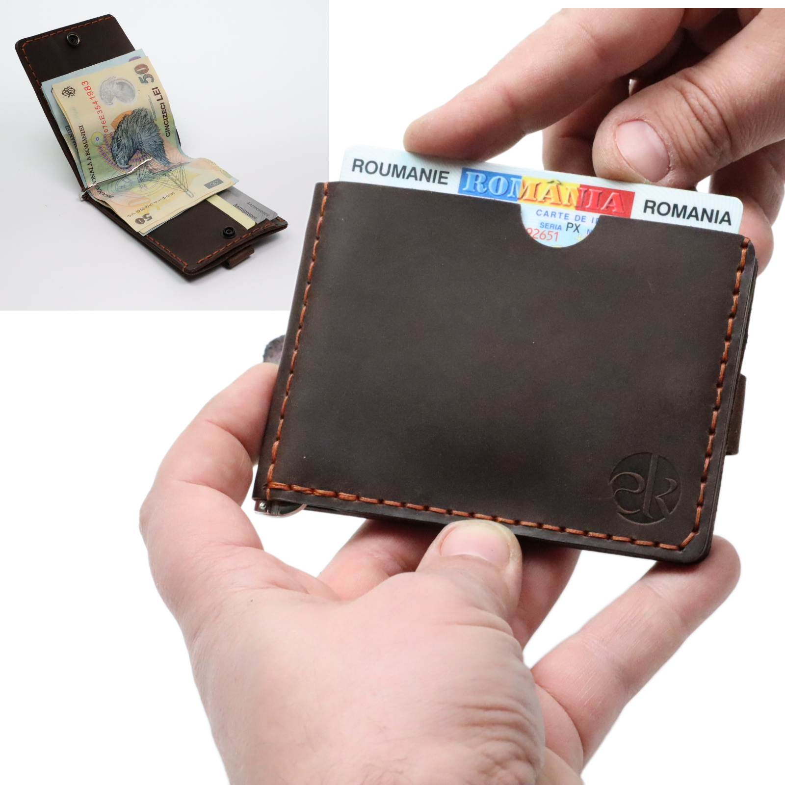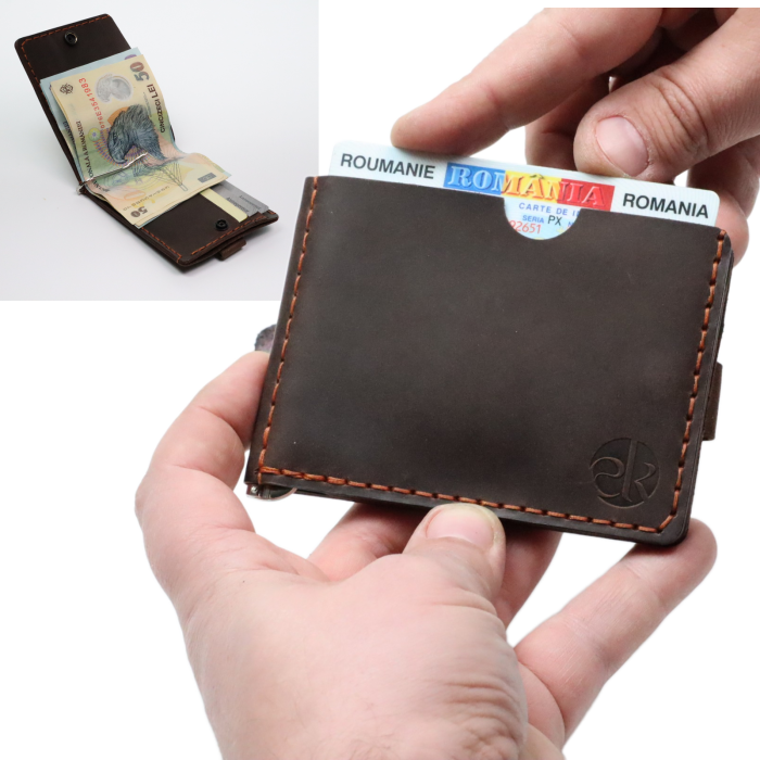 Designul interior inteligent include compartimente pentru carduri, un spațiu pentru bancnote și un buzunar pentru monede (după caz), toate organizate eficient într‑un format slim care se potrivește confortabil în buzunarul pantalonilor sau al gecii. Cusăturile lucrate manual adaugă rezistență și un detaliu estetic rafinat, reflectând atenția la calitate și meșteșug.