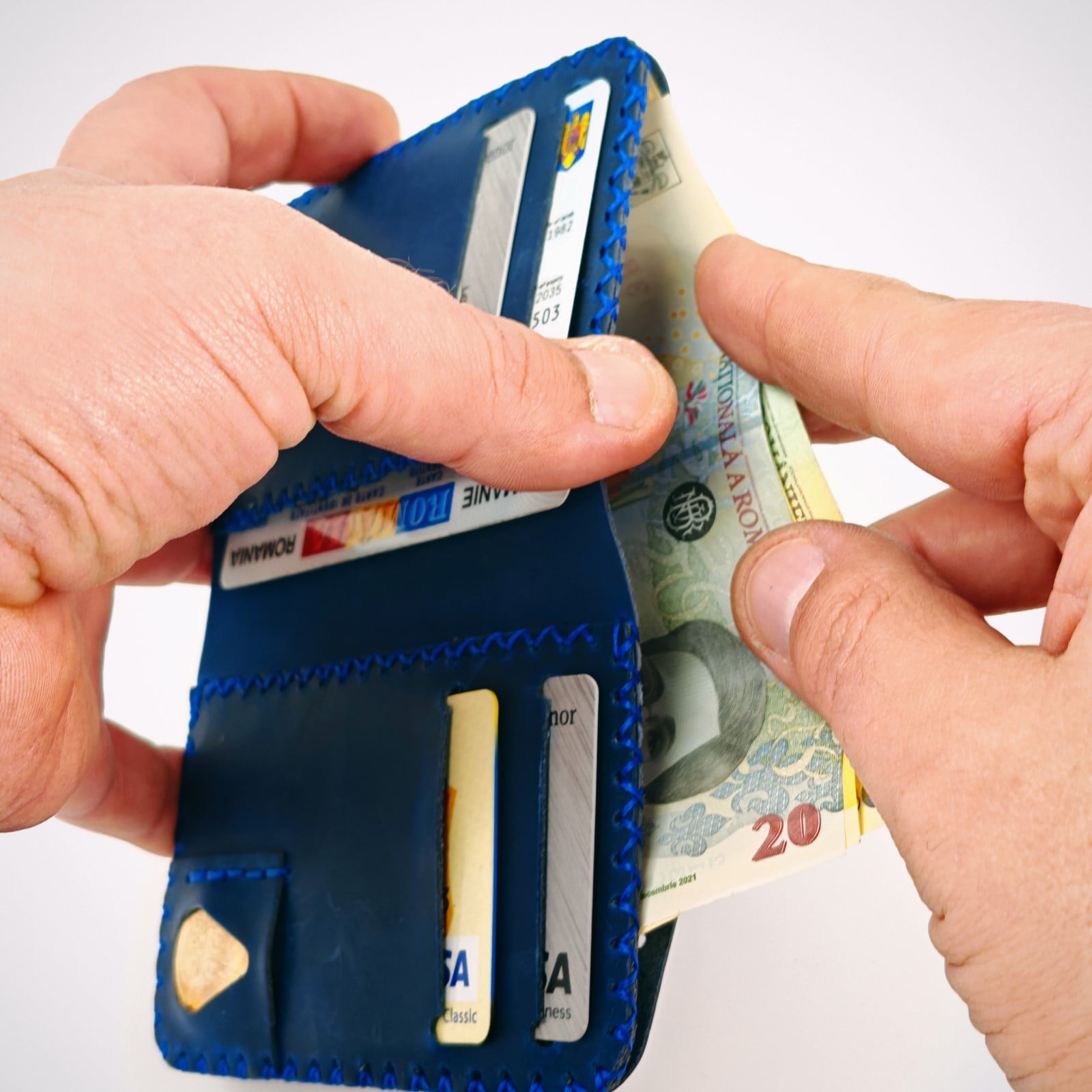 Portofel, personalizabil, din piele naturala, Jack M, Albastru – spațiu cât trebuie, fără compromis