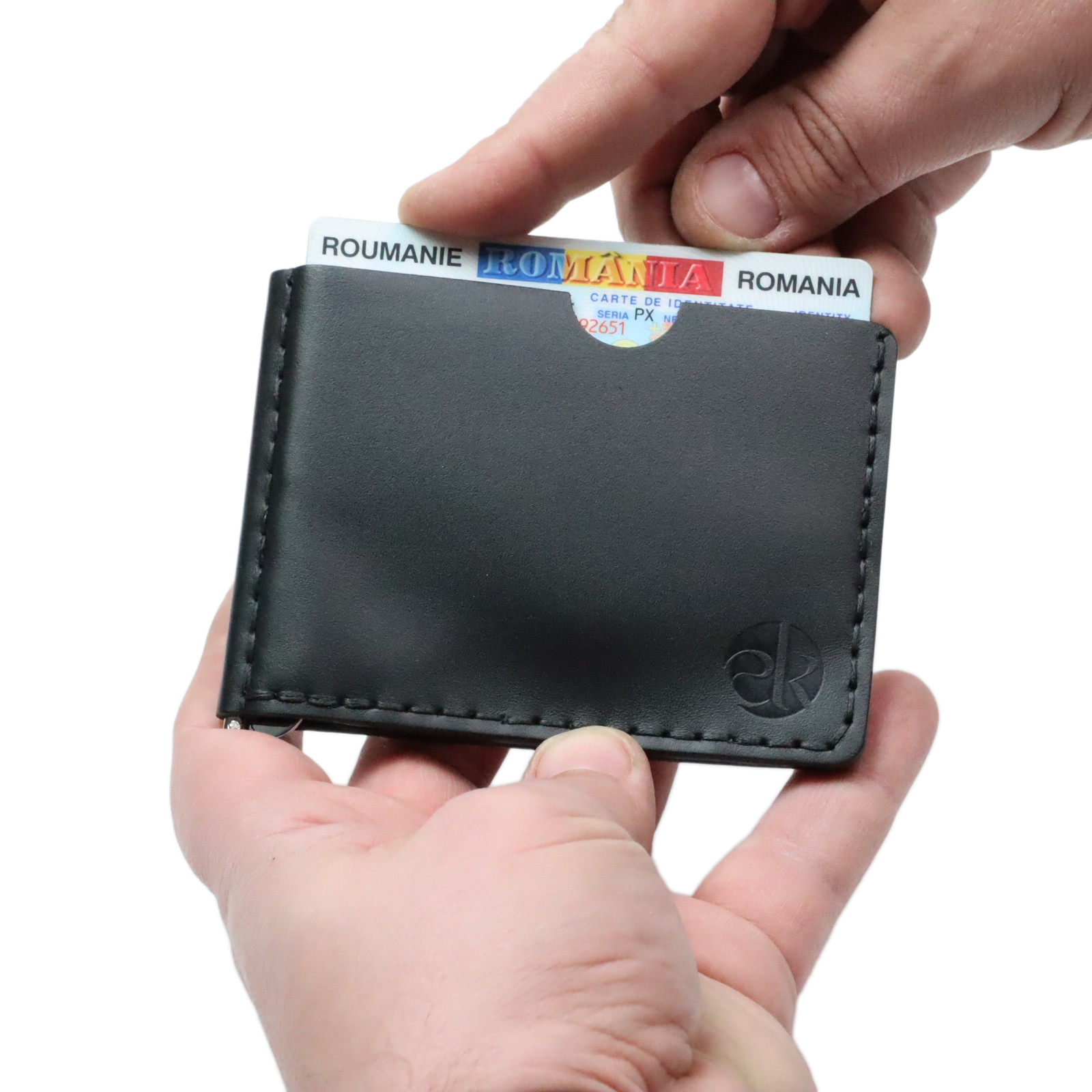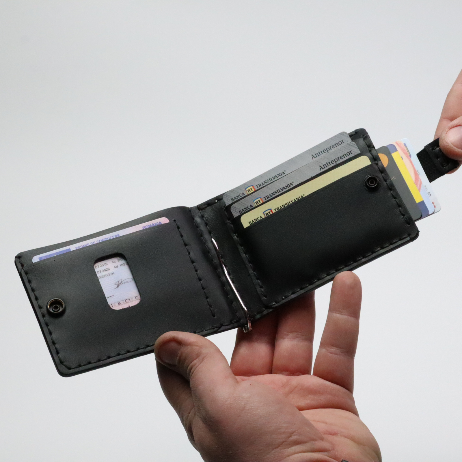 Interiorul este gândit pentru organizare inteligentă: include compartimente pentru carduri și un spațiu pentru bancnote, toate integrate într‑un format compact, care se potrivește confortabil în buzunarul pantalonilor sau al gecii. Textura naturală a pielii și cusăturile lucrate manual îi conferă rezistență și o senzație plăcută la atingere.