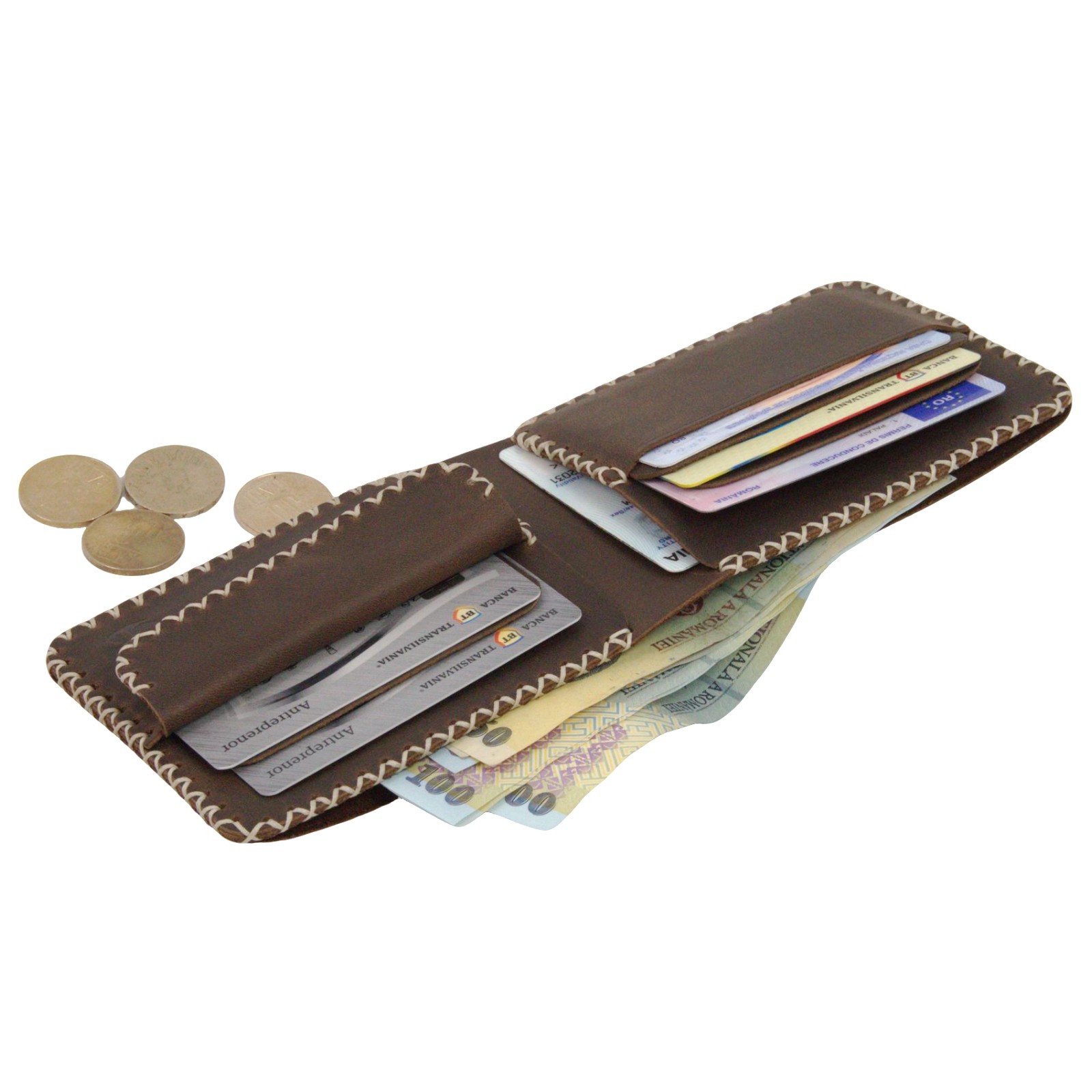 Compartiment bani: 1 secțiune pentru bancnote (încap desfășurate, fără pliere forțată) + 1 buzunar monede.
